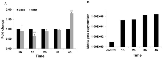 Our earlier studies [23] showed that the host cellular response (for cell survival) in response to the viral invasion occurs at the early stages of infection (up to 3 h). Thus, it is appropriate to look for changes that occur at early hours of infection, before the virus take control of the cell metabolism and signaling. To validate the initial microarray analysis, A549 cells were infected with IAV for 1 to 4 h and miRNA expression was analyzed by RT-PCR. MiR-4514 expression was significantly decreased at 1 h exposure to IAV compared to mock infected control (Figure 3A), increased at 2 h to the level observed at 3 h in the microarray analysis, but then decreased again at 3 h and 4 h. The data from RT-PCR is more sensitive and reliable than microarray analysis and may account for the apparent discrepancy in expression between these assays at 2–3 h. Expression of miR-4776 in infected cells increased significantly throughout the (1–3 h) infection, and expression peaked (12 fold increase) by 3 h and then sharply decreased by 4 h (Figure 3B), a similar trend was seen by array analysis with the difference in incubation time of 1 h, the difference in time again could be due to the increased viral copies in array. The array data showed a decrease at 3 h, and the difference in time with validation and array could be attributed to the difference in MOI. Expression of miR-4742 decreased in the initial 3 h of infection and then increased by 4 h to that level in the mock infected control (Figure 3C). This return to basal level of miR-4742 after 4 h of infection was also seen after 3 h of infection in the initial microarray analysis, which may be due to the higher MOI of 3 used in the microarray analysis. The high MOI used in the array analysis was to ensure that every cell in culture was infected with one or more virus, whereas in the validation studies, we reduced the MOI to 1, so that the overburden of the virus on the culture cells could be avoided and the host cells response to viral infection could be measured. A549 cells are transformed lung epithelial cells that could also produce variation in expression compared to primary normal lung cells, hence we used human primary bronchial epithelial cells to confirm the repeatability of the results.