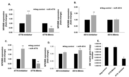 We compared the expression levels of NFKBIB mRNA with those of the three miRNAs in HBEpC cells. Expression of NFKBIB mRNA significantly decreased 1.6-fold after 1 h of infection, returned to the level of the mock infected control after 2 h and 3 h, and then significantly increased ( 2-fold) after 4 h exposure to IAV (Figure 4A). When the expression of the three miRNAs (miR-4415, 4742, 4776) was compared with that of NFKBIB mRNA, only miRNA-4776 showed an inverse correlation, as would be expected if NFKBIB mRNA expression is regulated by the specific miRNA. The influenza copy number gradually increased after 4 h of exposure to IAV (Figure 4B). A classical approach to identify the actual target mRNA of these miRNA is by introducing mimics and inhibitors of the specific miRNA and evaluating the target gene expression [29,30]. We further examined the role and specificity of miR-4776 and miR-4514 miRNAs to NFKBIB but did not study miR-4742-3p, as it did not appear to have a pattern of expression, suggesting it is involved in NFKBIB expression.