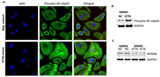 Unstimulated cells contain a pool of NF-κB dimers in the cytosol that are stoichiometrically bound with the inhibitors [16]. NFKBIB is complexed with NF-κB but upon infection or external stimuli activated NF-κB is released [17], and subsequently translocated to the nucleus where it induces transcription of genes. HBEpCs transfected with mimic miR-4776 followed with IAV infection for 4 h were monitored for the expression of NF-κB by confocal microscopy (Figure 6A) and compared to the negative control. The cells were stained with an antibody to phosphorylated NF-κBp65 that specifically binds to the p65 component of active NF-κB (green), and the nucleus was stained with DAPI (blue). Active phosphorylated NF-κB was significantly higher in miR-4776 transfected cells compared to the negative control mimic transfected cells infected with IAV (Figure 6B). This data suggests that mimic miR-4776 lowers the levels of NFKBIB mRNA and the amount of NFKBIB protein available to bind with NF-κB results in an increased level of active NF-κB. This is consistent with previous studies that showed NFKBIB, once released from the NF-κB/NFKBIB complex, undergoes degradation and leads to the phosphorylation and activation of NF-κB [18,33]. We further confirmed the results obtained by confocal microscopy with Western blot analysis. Data presented in Figure 6B shows that phosho-NF-κB p65 is overexpressed in cells transfected with the miR-4776 mimic compared to the negative control mimic transfected cells. The 4 h time point of infection was selected based on the results (Figure 3E and Figure 4A) wherein 4 h exposure to IAV showed a reduction in miR-4776 expression and upregulation of NFKBIB transcripts. Moreover, the miR-4776 mimic transfected cells showed a reduction in NFKBIB protein compared to the control cells transfected with negative control (Figure 6C). Taken together, the results from this study clearly indicates that miR-4776 has a significant role in regulating NFKBIB expression to alter the level of active NF-κB.