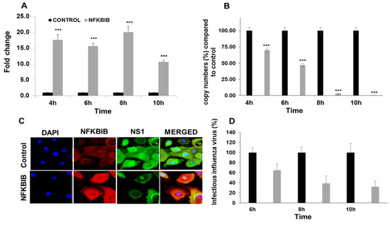 NFKBIB overexpression leads to reduction in IAV M gene copy number. (A) HBEpCs grown to 80% confluency were transfected with NFKBIB plasmid or control plasmid for 36–48 h. NFKBIB overexpressing HBEpCs were infected with 1 MOI of IAV for another 10 h, and the expression of NFKBIB was analyzed using RT-PCR. *** p < 0.001 (n = 3); (B) NFKBIB overexpressing HBEpCs were infected with 1 MOI of IAV for another for 10 h, and the IAV matrix gene copy numbers were analyzed using the matrix gene primers, and a standard curve for the matrix gene. *** p < 0.001(Black—Control plasmid, Grey—NFKBIB gene overexpressing); (C) HBEpCs overexpressing NFKBIB gene were cultured on slides and infected with IAV of 1 MOI. Cells were then fixed and stained with NFKBIB (red) and NS1 (influenza) antibodies (green), followed by respective fluorescent secondary antibodies. Nucleus (blue) was stained with DAPI. Slides were observed under the Laser Scanning Microscopy (LSM)-510 confocal microscope using an oil 63X objective; (D) HBEpCs grown to 80% confluency were transfected with NFKBIB plasmid or control plasmid for 36–48 h. NFKBIB overexpressing HBEpCs were infected with 1 MOI of IAV for another 10 h. Culture supernatant were collected at different time points. Percent infectious influenza virus was determined by viral plaque assay from culture supernatant. Percent calculations were normalized to control cells infected with IAV.