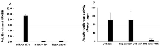 We then addressed the specificity of miR-4776 to target NFKBIB mRNA using the 3’ UTR Luciferase Reporter Assay. Luciferase UTR experiments are considered the confirmatory experiments in miRNA target identification in various studies utilizing miRNA [38,39]. The 3’ UTR of NFKBIB predicted to interact with miR-4776 was cloned into a reporter luciferase vector and co-transfected with miR-4776 mimic into HBEpC cells. Transfection of miR-4776 mimic resulted in 80% reduction in luciferase activity compared to that from cells transfected with the negative control (Figure 8B). These results demonstrate that miR-4776 regulates NFKBIB mRNA expression through binding of the 3’ UTR.