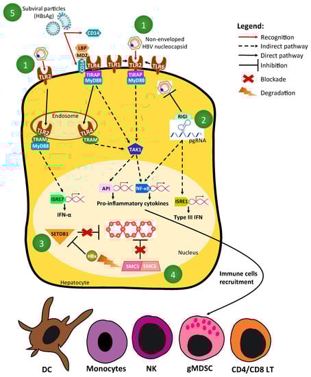 Hepatitis B virus (HBV) detection by innate immune sensors and regulation by host factors. (1) Non-enveloped HBV nucleocapsid composed of HBV core/capsid antigen (HBcAg) can be recognized by Toll-Like Receptor 2 (TLR2), triggering pro-inflammatory cytokine secretion in TLR2-positive liver cells via TRIF-Related Adaptor Molecule/ Myeloid Differentiation primary response gene 88 (TRAM/MyD88) or TIR domain-containing Adapter Protein (TIRAP)/MyD88 adaptation and Activator Protein 1 (AP1) and Nuclear Factor kappa-B (NFκB)-dependent pathways; (2) RIG-I could be a sensor of the “epsilon (ε) stem-loop” present in pregenomic RNA (pgRNA). This recognition leads to the production of type-III interferon (IFN) via both interferon regulatory transcription factor (IRF) 3 and NFκB-dependent pathways, as well as to the sequestration of pgRNA and a subsequent decrease of relaxed circular DNA (rcDNA) synthesis; (3) SETDB1, a histone-methyl-transferase, impairs covalently closed circular DNA (cccDNA) transcription, which can be reverted by HBx; (4) Structural Maintenance of Chromosome 5 and 6 (SMC5/6) complex inhibition of cccDNA transcription can be reverted by HBx, which induces SMC5/6 degradation in a DNA-Damage-Binding 1 (DDB1)-Cul4-E3-ubiquitin-ligase-dependent manner; (5) Subviral particles (i.e., HBV surface antigen or HBsAg) could interact with CD14, leading to their internalization and cell activation in TLR4 positive cells.