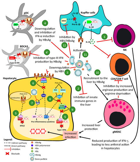 HBV modulation of innate immune sensors. (1) Interleukin-10 (IL-10) production can impair Natural Killer (NK) cell function, including the non-cytotoxic anti-HBV action of IFN-γ in infected hepatocytes; (2) HBV inhibit innate immune gene inductions in the liver according to HBeAg and HBsAg status; (3) TLR2 is down-regulated by HBV in hepatocytes, leading to a reduced production of pro-inflammatory cytokines/chemokines; (4) HBsAg down-regulates TLR9 in pDC, leading to the inhibition of IFN-α production and; (4’) HBsAg inhibits type-III IFN production upon TLR3 stimulation, hence preventing a relevant NK cell activation; (5) HBc can block the production of IFN upon dsRNA recognition receptor stimulation by the recruitment of EZH2 and immune promoters methylation; (6) HBeAg binds to TIRAP/MyD88 complex to inhibit the TLR2 signaling pathway; (7) HBsAg inhibits JNK pathway preventing IL-12 production; (8) HBx inhibits the dsRNA-mediated IFN response by interacting with host-factors (MAVS, TRIF, IRF3) and/or inducing their degradation by proteasome; (9) HBV polymerase inhibits the dsRNA-mediated IFN response by interfering with the STING and DDX3 function; (10) HBsAg can recruit and trigger the expansion of granulocytic Myeloid-Derived Suppressive Cells (gMDSC), which in turn, specifically inhibit CD4+ and CD8+ T-cell by the production of a large amount of arginase, leading to metabolic deprivation; (11) HBV can activate Kupffer cells (KCs) by the TLR2 pathway, leading to the production of IL-10 and the subsequent inhibition of the lymphocyte response; (12) HBsAg inhibits the AIM2-inflammasome and blocks the production of IL-1β, which has a strong antiviral effect on HBV replication in hepatocytes.