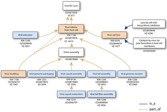 The GO team at the European Bioinformatics Institute (EBI) collaborated with the UniProtKB/SwissProt team to update and complete the GO database with the virus life-cycle molecular processes. The mapping effort led to the update of 24 GO terms and the development of 30 new GO terms (Table 1). Forty one of those are directly related to ViralZone vocabulary and reciprocally linked in the ViralZone and GO pages []. The ViralZone vocabulary does not exactly match GO ontology because the first provides general scientific knowledge, while the second defines concepts/classes used to describe gene function, and the relationships between these concepts. For example, the page “Viral penetration via permeabilization of host membrane” (VZ-985) in ViralZone describes the general process used by eukaryotic and bacterial viruses. In GO, this led to the creation of two terms because the eukaryotic and bacterialmembranes involved are not the same. The term created for prokaryotes is “viral entry via permeabilization of inner membrane” (GO:0099008), and the term for eukaryotes is “permeabilization of host organelle membrane involved in viral entry into host cell” (GO:0039665). Other terms like “Tailed bacterial virus” (VZ-4076) are concepts that cannot be strictly associated with a gene function and therefore do not lead to the creation of a corresponding GO term.