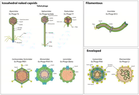 Structure of bacterial virus particles. The picture displays the different virion structures classified under three categories: icosahedral naked capsid, filamentous or enveloped particle. A representative viron structure is represented for each of the nine bacteria virus families.