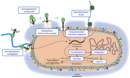 Before entering the lytic cycle or the lysogenic/latency cycle, the cytoplasmic viral genome undergoes a few more processes. A DNA virus genome can go through “viral genome circularization” [,], and/or “viral genome integration” into the host chromosome []. These events most often coincide with a crucial step called “latency-replication decision”, which depends on a molecular switch such that the virus will either enter “latency/lysogeny” or proceed to replication-assembly and lysis of the host. Latency results from the expression of regulatory and enzymatic proteins that lead to the establishment the viral genome as a silent provirus, which is replicated passively as part of the host genome. If the provirus is never reactivated, its sequence could eventually evolve as a provirus fossil. However, proviruses are also programmed for “viral reactivation from latency”. Under certain circumstances the latent genome is reactivated and initiates the transcription and replication lytic cycle. Most integrated proviruses undergo “viral genome excision” before viral replication [].