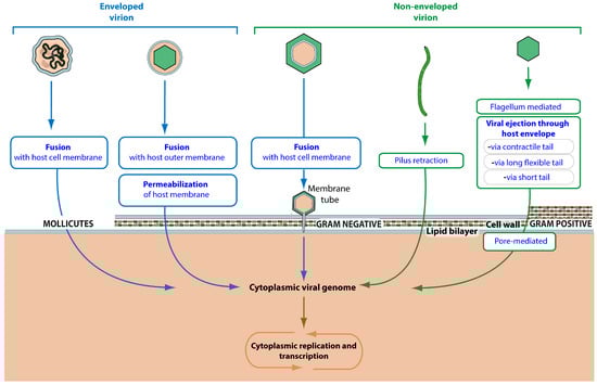 “Virus entry” refers to all the steps happening between the circulating virion binding to a target cell up to the delivery of viral genetic material to the site of replication or latency (Figure 3). The viral genome begins on the top of the picture and will follow alternative pathways until entering latency or the start of a lytic cycle. The nature of the virus particle plays a decisive role in the routes of entry: enveloped viruses do not face the same challenges as non-enveloped viruses. In turn, the composition of the host membranes and cell wall are determinant to the entry: crossing the cell envelope of Mollicutes bacteria is quite different to crossing that of Gram-positive bacteria, the envelope of which is covered by a thick glycan wall.