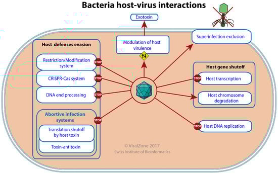 Most host-viral interactions are parasitic, because of the selfish nature of viral entities, but a virus cannot exist without its host; therefore beneficial interactions have also evolved that promote both virus and host survival. Many viruses that can enter latency/lysogeny protect their host cell from being infected by other similar viruses, through a process called “superinfection exclusion” []. This exclusion can be induced by silencing the incoming viral genome as performed by the immunity repressors of many temperate bacterial viruses including enterobacteria phage lambda []. Alternatively the entry of superinfecting viruses can be inhibited at the level of receptor binding [], cell wall degradation or DNA ejection/translocation []. Viruses can do more than protect their host against their own kind. Being mobile genetic elements they can induce a mutualistic symbiosis by “modulation of host virulence by virus”. The latent virus can bring about a wide range of functions beneficial to its host and itself. “Viral exotoxins” (e.g., botulism toxin, diphtheria toxin, cholera toxin, and Shiga toxin, which can be found in various viruses) are secreted polypeptides that are beneficial for parasitic bacteria []. Bacterial viruses can also carry antigenicity modulator, intracellular survival factors, adhesion or invasion factors, or photosynthetic genes [,].