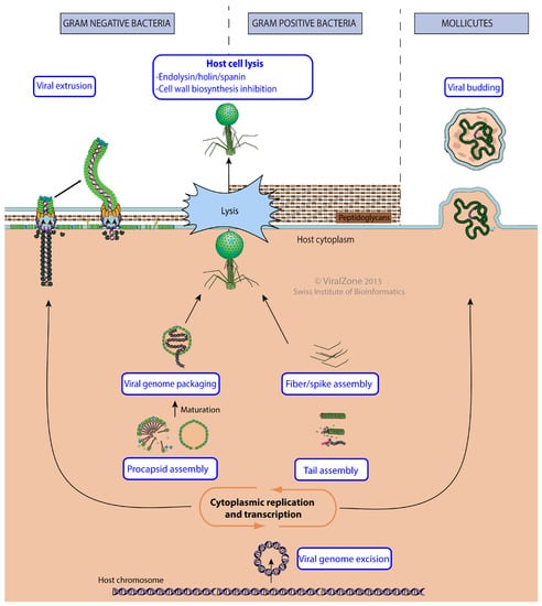 Filamentous bacterial viruses like enterobacteria phage M13 follow a different assembly procedure, called “viral extrusion” []. During this process, viral structural proteins are anchored in the host plasma membrane, across which the viral genome extrudes by covering itself with the capsid proteins. The budding of Plasmaviridae enveloped virus involves the protection of its circular DNA genome by a helical capsid, which exits the host cell by “viral budding” at the plasma membrane in ways similar to eukaryotic enveloped viruses [].