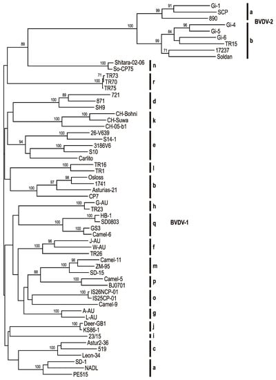 Bovine viral diarrhea virus (BVDV) is an important pathogen of cattle with a global distribution and causes major economic losses [1]. The two species BVDV-1 and BVDV-2 are members of the Pestivirus genus within the family Flaviviridae. Currently, the International Committee on Taxonomy of Viruses (ICTV) recognizes four approved Pestivirus species: BVDV-1, BVDV-2, Classical swine fever virus (CSFV), and Border disease virus (BDV) [2]. Moreover, a growing number of additional tentative Pestivirus species from various domestic and wildlife animal species has been described: (i) “Giraffe” virus, comprising an isolate obtained from a giraffe in Kenya, that caused mucosal disease-like symptoms, as well as one bovine isolate [3,4]; (ii) “Pronghorn” virus, isolated from a blind pronghorn antelope in the USA [5]; (iii) “Bungowannah” virus, that was isolated from pigs in Australia [6]; and (iv) atypical “HoBi-like” pestiviruses detected in the serum and other samples from bovine and buffalo [7,8,9]. Recently, additional putative new pestivirus species have been described, including Aydin-like viruses isolated from sheep and goats in Turkey [10], atypical porcine pestivirus causing congenital tremor in piglets [11,12], a pestivirus from a bat [13], and a pestivirus from rats [14]. In contrast to the approval and classification of Pestivirus species, subdivision of BVDV-1 and BVDV-2 into genetic groups is not an issue of the ICTV, but widely used in studies characterizing BVDV isolates.