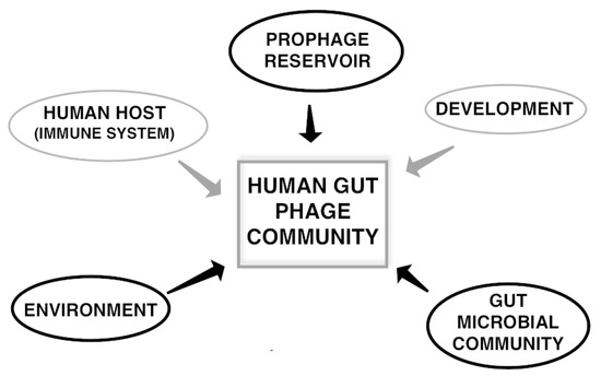 Major factors influencing the structure, function, and dynamics of the gut phage community. Factors that can influence the phage community and serve as a source of phages are marked in thick black circles. Factors that only influence the viral community composition are marked in grey.