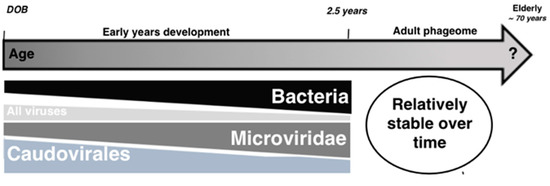 Schematic representation of the gut phage community development with age. Individuals are colonized early after birth, within 0–4 days after birth (DOB). During the first days of life, the diversity of the phage community is high and the microbial community abundance and diversity is low [51]. A reduction in Caudovirales diversity leads to an expansion and a shift in the microbial community composition and an increase in Microviridae phage diversity and abundance. A relatively stable phage community is maintained during the adult life. Changes in the phage community associated with a shift towards an elderly-like microbial community are unknown.