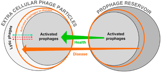 Understanding the balance between lytic phages, activated prophages, and the total prophage reservoir is important in understanding the healthy gut. Mills and colleagues proposed the community shuffling model (Box 1) [17,18], which explains the shift from health to disease through increased induction of certain prophages. Prophage activation is likely sensitive to stress, therefore processes such as inflammation in patients with IBD are likely to result in an increase of prophage activity (Figure 3). Determining activation dynamics of specific prophages during “steady-states” may help to identify what is necessary to bring a community structure back to equilibrium from dysbiotic states. A study aimed at investigating the active portion of the total prophage reservoir and the level of prophage activation showed that: (i) prophage activation varies with time; (ii) approximately 24% of predicted prophages with a known host are active in at least two individuals; (iii) an abundance of prophage-taxa is generally correlated with the abundance of activated prophages; and (iv) a set of 50 active core prophages are found in more than half of the individuals [78]. Furthermore, the activation levels of the 25 most abundant prophages predicted from reference genomes showed no or a low level of induction for ~50% of the prophages, as indicated by the equal abundance of prophage and host DNA (molar ratio 1:1). In ~40% of the cases, the abundance of the prophages was less than the abundance of its host genome (molar ratio < 1), suggesting that the prophage was absent in a portion of the host population. In the remaining 10% of the cases, prophages were considerably more abundant (molar ratio > 1), suggesting prophage induction of a large portion of the population or infection in a different host. These findings are consistent with a similar study previously carried out by Stern et al. [85]. Prophages associated with reference genomes that contained either antibiotic resistance genes or virulence factors were found to be activated at low levels in almost all individuals [78]. These results suggest that prophages with beneficial genes for the host are more likely to be maintained active within the community. Additionally, some prophage taxa were related to multiple host taxa. This implies that the host with which a given prophage is associated might be more important than the presence or absence of the prophage itself. Recent studies have shown molecular mechanisms involved in controlling the switch between lysis and lysogeny at the single cell level [21,23,92]. The importance of a carrier state of the temperate phage as a non-integrated episome to maintain a stable coexistence of a phage and its host has recently been shown [23], adding complexity to the studies of lysogeny. Combining molecular studies with whole community and EC-phage analysis of phages correlated with health and disease will likely contribute significantly to our understanding of the equilibrium of phages during health.