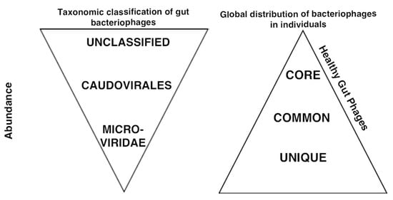 Bacteriophages in adult healthy individuals. The bacteriophage community of adult individuals is composed of members of the Caudovirales order, the Microviridae family and a large fraction of unclassified phages. Healthy individuals contained a relatively unique phageome and a set of shared phages between individuals that is globally distributed (<5% of total phageome). This set of shared phages has been correlated with health and proposed as the healthy gut phageome (HGP).