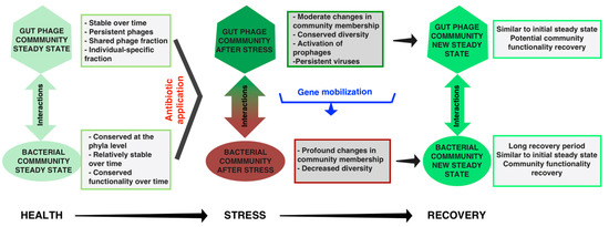 The gut microbiota is deeply affected by antibiotic treatment, after which a new, but similar, microbial “steady-state” is restored [4,111] (Figure 5). In contrast, the diversity of the viral community measured through the HVDI index is unaffected despite a shift in the overall viral community membership, and the persistence of certain viral species [87,112]. Overall, individual-specific patterns are maintained and the viral community reaches a new “steady-state” after antibiotic treatment as well [87,112]. Interestingly, an increase of antibiotic-resistance genes in the gut virome has been associated with antibiotic exposure [39,112]. Modi and colleagues demonstrated the HGT-based contribution of the phage fraction to the resilience of the microbiome after antibiotic treatment [39] (see Sun et al. for a detailed review [113]). The functional resilience of a healthy microbiome is not strictly dependent on taxonomic diversity. Multiple gut microbial communities can provide a similar level of functional resilience [3,4,5]. In comparison, due to a high fraction of unknown sequences in gut metagenomes, the functional diversity provided by the phageome is not well understood [61]. Moving towards a more complete understanding of the functionality of the gut phageome is needed. Overall, the potential of phages to contribute to the resilience of the microbiome suggests that phages play a role in maintaining a healthy equilibrium in the gut and are likely influential in the re-establishment of healthy symbiosis from disease.