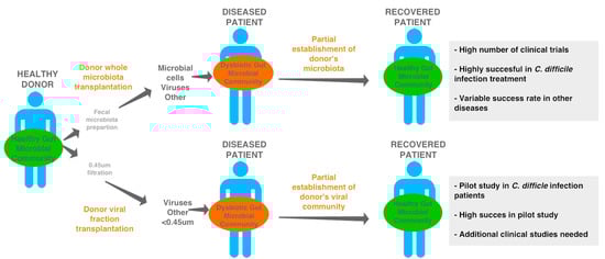 Fecal microbial and the potential of viral filtrate transplant treatment to restore health. Fecal microbial transplants are considered a successful tool to treat certain microbiota-associated diseases and disorders [115,116,117,118,119,120,121,122,123,124,125,126,127]. Recently, a pilot study demonstrated that a transplantation of viral filtrates was sufficient to restore health in Clostridium difficile patients. This result highlights the potential for viruses to influence microbial communities, ultimately affecting health and disease.