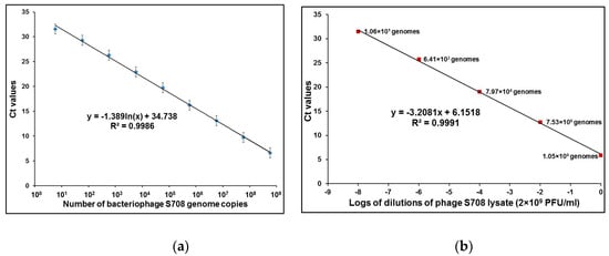 qPCR of purified DNA of brucellaphage S708 (a) and S708 lysate (b). Calibration curve (a) was established using qPCR of 1 µL aliquots of nine different 10-fold dilutions of purified DNA from brucellaphage S708, ranging from 0.35 fg to 3.5 ng. Calibration curve (b) was established using qPCR of 1 µL aliquots of several 100-fold dilutions of phage S708 lysate, ranging from ~100 to ~108 PFU. The number of viable particles per sample was confirmed by plaque assays Ct: cycle threshold.