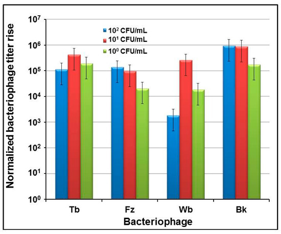 Amplification of brucellaphages Tb, Fz, Wb, and Bk on low concentrations of B. abortus S19. Phage lysates were diluted in saline magnesium (SM) buffer and added at 103 PFU/mL to the dilutions of bacterial culture in Brucella Broth at concentrations of ~1 × 102; ~1 × 101 and ~1 × 100 CFU/mL, which were confirmed by live bacterial counts. qPCR was performed after 72 h of incubation of each test culture with the corresponding phage.