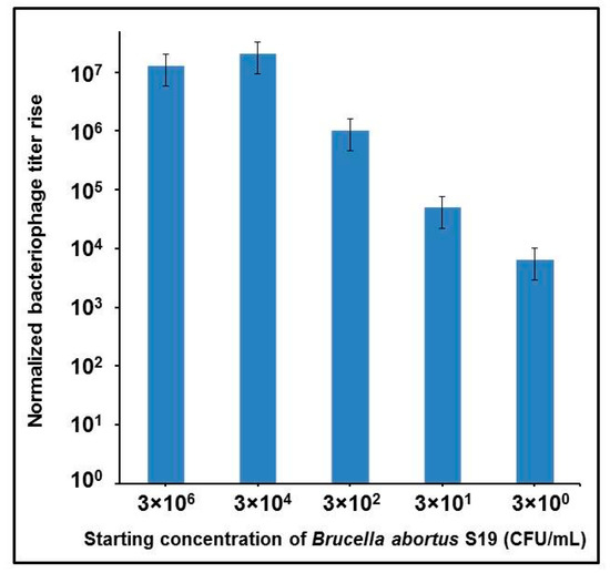 In order to address this inhibition, a simple and short (about 10 min) sample preparation step was added that included removal of erythrocytes, lysis of leukocytes and washing of the bacterial cells (see Materials and Methods). Sheep blood with Na2-EDTA was spiked with B. abortus at different concentrations, and the loss of bacteria over centrifugation steps was monitored. We observed not more than a 20% decrease of Brucella live count in the final water suspension in comparison with the initial blood sample. Bacteriophage Bk was selected for this test because of its broad host range [32,37,38]. After 72 h of incubation, robust phage amplification was revealed by qPCR even at the highest bacterial dilution, corresponding to single Brucella cells per milliliter of blood (Figure 5).