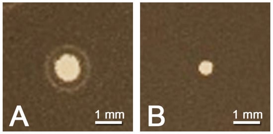 Plaque morphology of vB_BsuM-Goe2 (Goe2) and vB_BsuM-Goe3 (Goe3) on Bacillus subtilis Δ6 overlay plates. (A) Goe2 exhibits a plaque diameter of 1.1 mm with a halo of decreased turbidity on its periphery; (B) Goe3 exhibits a plaque diameter of about 0.6 mm in diameter.