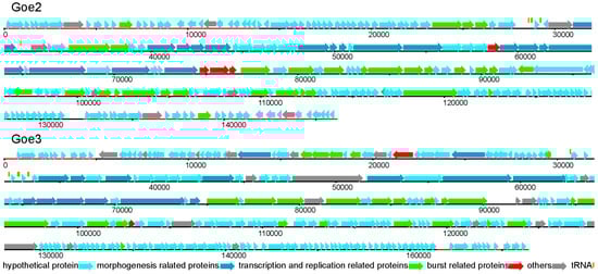 The morphology of Goe2 and Goe3 was analysed via transmission electron microscopy (TEM). The TEM micrographs are shown in Figure 3. Both virus particles exhibited a head and tail morphology, which is typical for members of the order Caudovirales. Furthermore, a long contractile tail was detected, characteristic of the Myoviridae family. Additional morphological features shared by both viruses were the isometric head capsid and the tail fibres attached beneath the baseplate, at the end of the tail protein. Both virions experienced a morphological change upon tail sheath contraction in the form of a double base plate (Figure 3B,D). All morphological properties support the assignment of Goe2 and Goe3 to the Spounavirinae subfamily []. The head of an intact Goe2 virion is about 95 nm wide and 103 nm high, and the tail 163 nm long and 18 nm wide. The head of an intact Goe3 virion is about 96 nm wide and 98 nm high, and the tail 163 nm long and 18 nm wide. Tail fibres of Goe3 are considerably longer than those of Goe2 (see Figure 3A,C).