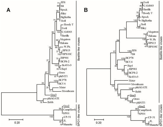 Phylogenetic classification of Goe2 and Goe3. The phylogenetic trees were calculated using (A) the major capsid protein of 34 Bacillus viruses and (B) the thymidylate synthase gene of 34 Bacillus viruses, and the Maximum Likelihood method. The trees are drawn to scale, with branch lengths measured in the number of substitutions per site. The percentage of trees in which the associated taxa clustered together is shown next to the branches. Goe2 and Goe3 are underlined. Goe2 clusters into the branch of SPO1-like viruses in close proximity to SPO1 and CampHawk, in both calculations. Goe3 clusters into the Bastille-like virus branch with noticeable distance to Grass and phiNIT1 in (A) and in close proximity in (B).