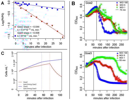 All physiological parameters of Goe2 and Goe3 were combined in a simulation for cross verification as all were determined independently from each other. Thus, a bacterial infection of 108 cells mL−1 with a MOI 1 was simulated in R []. During the first infection cycle, an increase of cell density was calculated in both theoretical cultures. After the first burst of Goe3 the infected culture still exhibited growth, whereas the cell density of the Goe2-infected culture noticeably decreased (see Figure 7C). This simulation is in good agreement with the actual trend of the monitored cell density during the determination of the latency period (see Figure 7B), and thus cross verifies the experimentally determined physiological parameters.