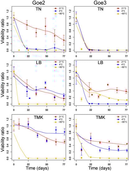 Viability test of Goe2 and Goe3. Virion viability was determined via plaque overlay assay. Each data point is the average of three replicates. The standard deviation is shown through error bars. Data determined at 21 °C are presented in red, at 4 °C in blue and at −80 °C in orange. For data regression the loess.smooth function in R was used.
