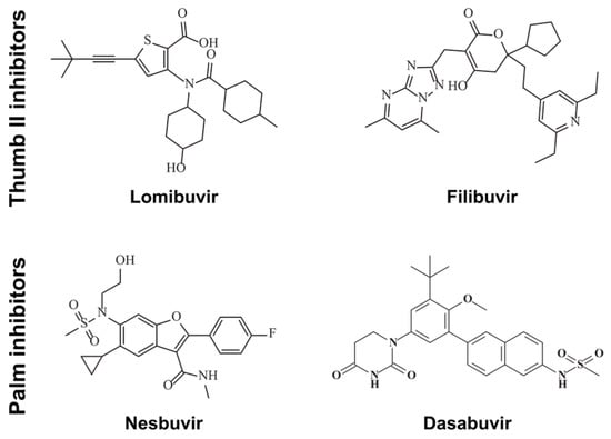 In order to avoid problems associated with nucleotide analogues such as inhibition of other essential human enzymes, for example, mitochondrial DNA polymerases, RNA polymerases, kinases, DNA methyltransferases, and some others [20,21], polymerase inhibitors that target allosteric sites have become popular. Five distinct allosteric binding pockets have been identified in NS5B, two in the thumb domain, two in the palm domain and one in the finger domain. Two allosteric non-nucleoside thumb II site inhibitors, filibuvir (PF-00868554) and lomibuvir (VX-222) (Figure 1) have shown good potencies, but their development has been paused for various reasons [22]. However, recently TREK therapeutics announced a further development of lomibuvir [23]. Also, allosteric palm site inhibitors of NS5B have been developed (Figure 1). Nesbuvir (HCV-796) was an early compound now discontinued due to liver toxicity. However, it indicated the possibility to develop compounds with pan-genotypic activity [13]. Dasabuvir is a more recent compound, but the FDA has only approved it for use in combination with other anti-HCV DAAs and ritonavir, originally an anti-human immunodeficiency virus (HIV) protease inhibitor [24].
