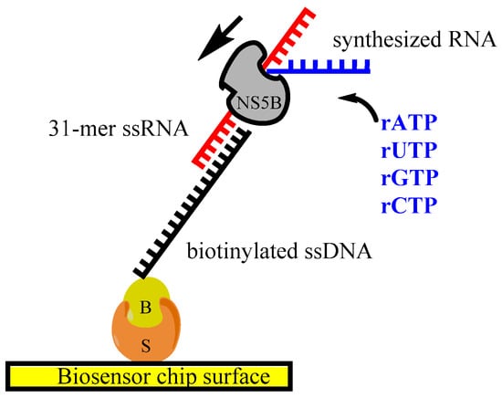 Figure 2. Illustration of the polymerase assay set-up on the biosensor chip using DNA/RNA hybrid template. The biotinylated single-stranded DNA (ssDNA) was immobilized on chip via streptavidin/biotin interaction. Subsequently, a 31-mer RNA was hybridized to the DNA by 8 complementary base pairs. The polymerase activity was monitored in real-time by injecting NS5B with nucleotides over the immobilized DNA/RNA hybrid. S = streptavidin, B = biotin.