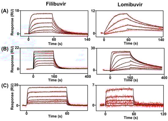 Figure 4. Interaction of thumb II inhibitors and sensor surfaces with immobilized NS5B from different genotypes. A two-fold dilution series, ranging from 1 to 0.0312 µM, was injected in order of increasing concentration. (A) Genotype 1b, isolate Con1; (B) genotype 1b, isolate BK; and (C) genotype 3a. The sensorgrams are blank and reference surface subtracted. The black lines correspond to fitted interaction models. RU: response units.