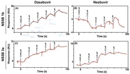 Figure 5. Interaction of dasabuvir with an NS5B 1b Con1 sensor surface (A). A two-fold dilution series, ranging from 1 to 0.0625 µM, was injected in order of increasing concentration. The single-cycle kinetic sensorgram is the reference subtracted. The black line corresponds to the heterogeneous model fitting. The calculated interaction parameters are presented in Table 3. Dilution series injections of nesbuvir over immobilized NS5B 1b Con1 (B). Injections of dasabuvir (C) and nesbuvir (D) over immobilized NS5B 3a.