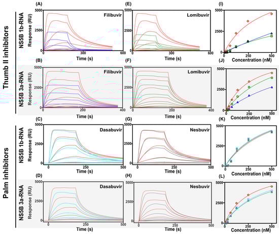 Figure 6. The effect of inhibitors on the interaction between NS5B from genotype 1b or 3a injected over the surface with immobilized RNA. NS5B 1b were injected in two-fold serial concentrations between 15.6 and 500 nM without inhibitors (red sensorgrams) and in the presence of filibuvir (A), lomibuvir (E), dasabuvir (C) or nesbuvir (G). The concentrations of thumb and palm inhibitors kept constant at 1 µM (A,E) or 2 µM (BD,FH), respectively. NS5B 3a were injected in two-fold serial concentrations between 15.6 and 500 nM without inhibitors (red sensorgrams) and in the presence of filibuvir (B), lomibuvir (F), dasabuvir (D) or nesbuvir (H). (IL) show the concentration-dependent signals at 75 s of NS5B 1b and 3a injected alone () and in complex with filibuvir (), lomibuvir (), dasabuvir (), and nesbuvir (). The corresponding equilibrium dissociation constants (KD) determined by a 1:1 steady-state affinity model are presented in Table 4.