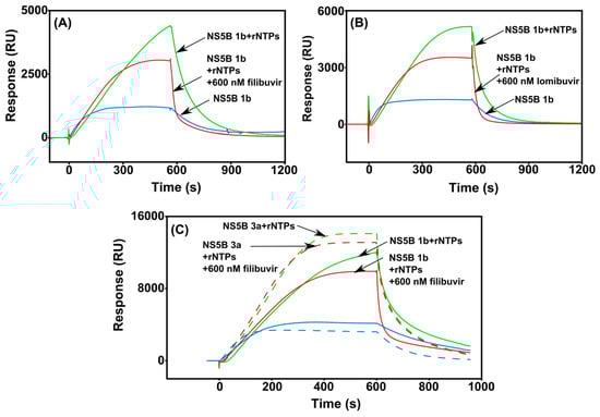 When the enzyme was injected together with rNTPs and inhibitor, the response levels were significantly lower, demonstrating inhibition of binding of the enzyme to the template RNA. The signals were higher than the controls without rNTPs, indicating that inhibition was only partial under these conditions (Figure 7). It is notable that the injection of NS5B polymerase together with either filibuvir or lomibuvir showed rapid dissociation (Figure 7A,B). These results support the experiments above and that the thumb inhibitors interfere with the interaction between RNA and NS5B. As expected, from the DSF and biosensor assays, thumb II inhibitors had no effect on the polymerase activity of NS5B 3a compared to NS5B 1b (Figure 7C).