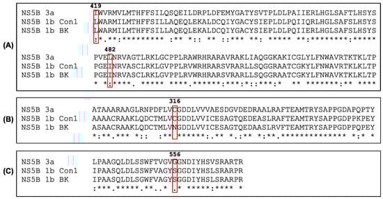 A sequence and 3D structure analysis of the studied NS5B variants was performed in order to understand the possible cause of the low affinity of the allosteric inhibitors for the genotype 3a polymerase. Overall, NS5B genotype 1b and genotype 3a sequences alignment showed about 77% of sequence identity and 96.5% between NS5B 1b Con1 and BK isolates. We focused on the residues in the binding pockets for studied allosteric inhibitors in NS5B 1b. The sequence analysis (Figure 8) shows that two amino acids in the filibuvir binding site of NS5B are different in NS5B 3a, i.e., L419I and I482L. Substitutions in both positions are known to be associated with genotype 1b resistance towards various non-nucleoside ligands binding in thumb pocket II [29]. Examination of palm site sequences revealed resistance-associated substitutions at S556G in the NS5B 3a sequence as compared to both 1b variants, and C316N in the 1b BK sequence [13,37].