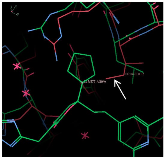 Figure 9. Close up view of thumb II binding site of NS5B 1b with filibuvir (PDB ID: 3FRZ) (green) superimposed with predicted structure of NS5B 3a (red). Residue L419 partially protrudes into the binding site of the cyclopentyl group of the inhibitor (white arrow).