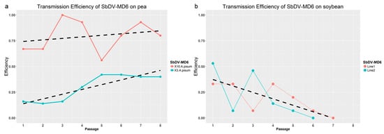 In peas, initial SbDV-MD6 inoculations were done with 10 aphids for each pea seedling. The transmission efficiency was 67% at first passage, and remained fairly consistently above 80% after the second passage with the exception of passage 5 (Figure 1a). In a second serial transmission with three aphids per plant, improvement was observed after the third passage, and the transmission efficiency was maintained at around 40% until the end of the serial passage experiment (Figure 1a). In pea serial passages, the transmission efficiency had a statistically significant increase with passages when using three pea aphids per plant. In contrast to serial passages in peas, SbDV-MD6 transmission efficiency in soybean generally deceased with serial transmission. The transmission efficiency on soybeans was more variable than the transmission efficiency on peas, and after five or six passages in soybeans, SbDV-MD6 transmission was reduced to the point where successful transmission did not occur in this experiment set up (Figure 1b).