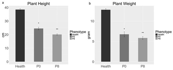 Statistical comparison of height and fresh weight of infected peas indicates significant differences between passages 0 and 8. Bars with one or two asterisks are significantly different from control plants at p < 0.05 (*) and 0.01 (**), respectively. Error bars represent the standard error of the mean based on two independent experiments.