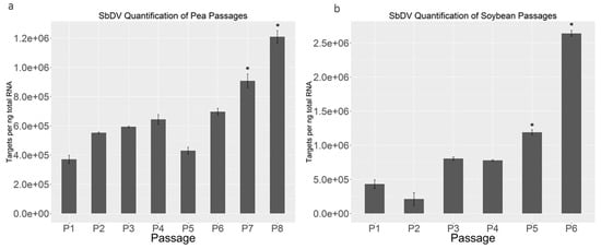 Quantitative real-time-PCR was used to assess viral titers of SbDV-MD6 in pea and soybean at each passage (Figure 4). Virus titers were determined in each of two independent experiments for both pea and soybean. All positive samples were tested individually with three replications. Using an SbDV-MD6 in vitro transcript as a template, the standard curve was established with serial dilutions in healthy plant extracts. The mean titer of first passages in peas was 3.7 × 105 target molecules per nanogram (ng) of total RNA extraction. The titers of SbDV-MD6 increased slightly with continued passage on peas (Figure 4a), and P7 and P8 were significantly different from P1, suggesting increased SbDV-MD6 concentration in peas following sequential transmission in the new pea host. The mean virus titer in the initial passages of soybean was 4.3 × 105 targets molecules per ng of total RNA extraction, and the virus titers for subsequent passages continued to increase (up to 2.55 × 106 targets), suggesting increasing virus titers with each subsequent transmission. Overall, there was a more dramatic increase of viral titers resulting from sequential soybean transmissions compared to pea. It indicated that SbDV-MD6 had an approximately 6-fold increase in viral titer by the end of both serial passage experiments.