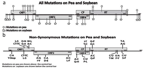 Locations of mutations that occurred on pea and soybean during serial transmissions. A schematic diagram of the host adapted SbDV-MD6 genomes with genes labeled are shown. (a) represents all mutations observed in SbDV-MD6 from pea (hexagons above genome) and from soybeans (stars below genome); (b) represents non-synonymous mutations observed in SbDV-MD6 from pea and from soybeans with nucleotide changes shown closer to the schematic, and amino acid changes shown distally from the schematic.
