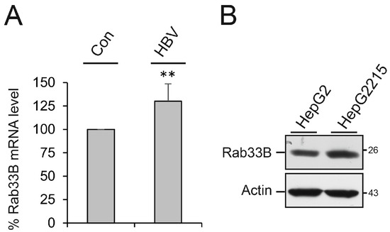 Since Rab33B-guided processes are pivotal for the HBV replication cycle, we next investigated whether HBV replication had an effect on cellular Rab33B gene expression. HuH-7 cells were transiently transfected with an empty plasmid backbone or the pHBV replicon for three days. For gene expression profiling, total mRNA was isolated and subjected to quantitative reverse transcription-PCR (qRT-PCR) with Rab33B-specific primers. As shown in Figure 5A, HBV replication upregulated Rab33B transcription by about 25% as compared to control cells. This upregulation, however, could not be observed at the protein level using the less sensitive immunoblotting technique. This is likely due to the degree of transfection, as only about 20% of the HuH-7 cells received DNA in a lipofection-based transfection assay [31]. To circumvent this limitation, the Rab33B protein levels were comparatively analyzed in stably HBV-expressing HepG2215 and parental HepG2 cell lines. As illustrated in Figure 5B, the amount of Rab33B was clearly increased in HepG2215 cells as compared to control cells.