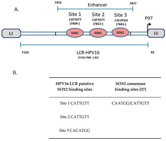 3.1. The LCR of HPV16 Contains Putative Binding Sites for SOX2