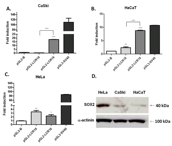HPV16- and HPV18-LCRs present a different transcriptional activity in cells with distinct histological origin. Reporter plasmids were transfected in CaSki (A), HaCaT (B) and HeLa (C) cell lines. The transcriptional activity is shown as the fold induction, compared to the pGL2-B vector. The standard error of the mean is shown; * p < 0.05, ** p < 0.01, *** p < 0.001. The square brackets show differences between transcriptional activities of LCRs from HPV16 and HPV18. pGL3-simian virus 40 (SV40) plasmid harboring SV40 promoter was used as a positive control. The graphs show representative experiments carried out in triplicate and repeated three times; (D) Representative western blot of SOX2 basal protein levels in HeLa, CaSki and HaCaT cell lines. For loading control α-actinin was used.