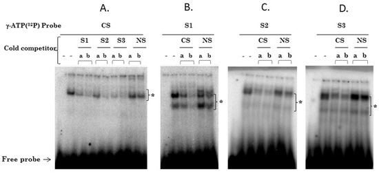 To determine whether SOX2 recognizes the three putative SOX2 response elements found in the HPV16-LCR, EMSA was performed using nuclear proteins from HeLa cells. The formation of one major DNA-protein complex (*) was observed when nuclear extracts were incubated with the SOX2 binding consensus probe (CS), labelled with γ-ATP (32P) (Figure 3A). In order to evaluate if the S1, S2 and S3 sites are able to compete with the DNA-Protein complex generated by the CS, different amounts of cold probes from S1, S2 or S3 were used. The complex formation with CS probe was strongly competed with the addition of 60 (a) and 260 (b) fold excess of the three cold probes; while cold non-specific oligonucleotide (NS) did not compete (Figure 3A). For S1, S2 or S3 probes we observed two major DNA-protein complexes (*) (Figure 3B–D). A similar behavior was observed when SOX2 sites (S1, S2 and S3) were inversely competed against a 50 (a) and 250 (b) fold excess of CS cold probe, where a clear drop in the DNA-protein complexes was observed, which was not observed with the NS cold probe (Figure 3B–D). These data suggest that SOX2 can bind to the three proposed binding sites found in the HPV16-LCR.