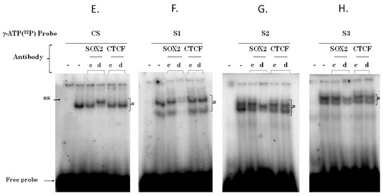 In order to demonstrate that SOX2 protein is present in the DNA-protein complex, a supershift assay was performed. The presence of SOX2 in the DNA-protein complexes was confirmed after the addition of 50 ng (c) or 2500 ng (d) of anti-SOX2 antibody, resulting in a supershift band (SS) in the CS complex when using 2500 ng of antibody (d) (Figure 3E). A significant reduction of the DNA-protein complexes of S1, S2 and S3 probes was observed with 2500 ng (d) of SOX2 antibody (Figure 3F–H). The specificity of SOX2 antibody was confirmed, since no change occurred with 50 or 2500 ng (c and d) of anti-CTCF antibody (Figure 3E–H). Thus, our in vitro results support the novel interaction of SOX2 with the three putative bindings sites present in the HPV16-LCR.