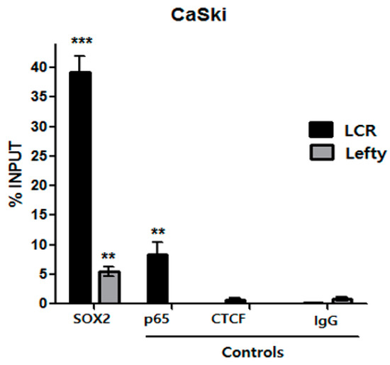 SOX2 binds to HPV16-LCR putative binding sites in vivo. Chromatin immunoprecipitation assay (ChIP) of SOX2 were performed evaluating the HPV16-LCR region (LCR) from CaSki cells. Anti-p65 and -CTCF antibodies were employed as positive and negative controls, respectively. Non-specific IgG antibody was included as a negative control. Quantitative PCR (qPCR) analysis was performed on the DNA obtained from the ChIP assay evaluating the HPV16-LCR region (black bars), and the Lefty (gray bars) gene promoter region, as a positive control of SOX2 binding (n = 2). The graphic represents the percentage of input recovered after immunoprecipitation with anti-SOX2, -p65 or -CTCF antibodies. Three independent biological experiments were performed. The standard error of the mean of triplicate qPCR measurements is shown. ** p < 0.01, *** p < 0.001.
