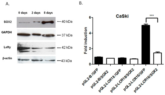 SOX2 represses the transcriptional activity of HPV16-LCR. (A) SOX2 was overexpressed in CaSki cells using a lentiviral system. Shown is a representative western blot of the expression levels of SOX2 and its target Lefty, at different days post-transduction (0, 2 and 8 days). Glyceraldehyde-3-phosphate dehydrogenase (GAPDH) and β-actin antibodies were used as protein loading controls; (B) CaSki cells transduced with lentiviral vectors expressing SOX2 and/or green fluorescent protein (GFP) were transfected with luciferase reporter plasmids containing LCR16 or LCR18. The transcriptional activity is shown as fold induction, compared to the pGL2-B/GFP vector. The graph shows a representative experiment carried out in triplicate and repeated three times. The standard error of the mean is shown. *** p < 0.001.