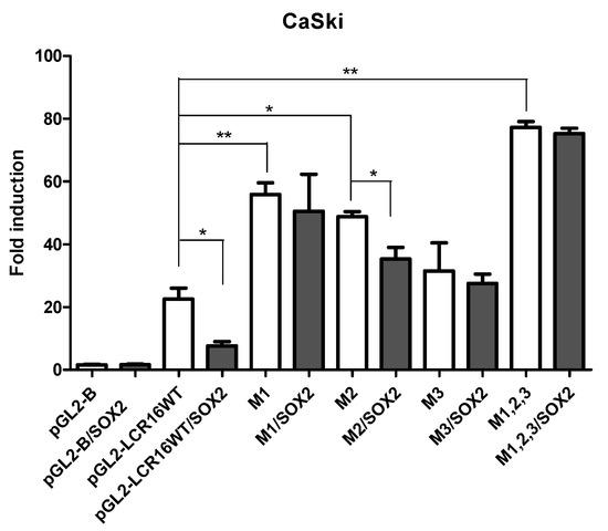 3.4. SOX2 Represses HPV16-LCR Transcriptional Activity