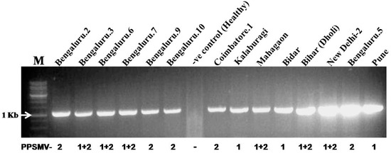 The primer combination targeting RNA1 segment resulted in amplicons of two distinct sizes; 702 nt for PPSMV-1 and 1202 nt for PPSMV-2 isolates (Figure 3). The multiplex-RT-PCR analysis of 23 SMD-affected pigeonpea leaf samples, collected from ten locations covering six states of India, showed that PPSMV-1 and PPSMV-2 are present in both northern and southern parts of India and also that they occur as mixed infections (Supplementary Figures S1 and S2). Previously published reports about the occurrence of both PPSMV-1 and PPSMV-2 isolates as single and mixed infection in Patancheru, in the state of Telangana are also indicated (Supplementary Figure S2) [1,2].