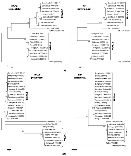 (a,b). Phylogenetic analysis of the nucleotide sequences of RNA3 and RNA4 and the amino acid sequences of the nucleocapsid protein (NP) encoded by RNA3 and the putative movement protein (MP) encoded by RNA4 of PPSMV-1 and PPSMV-2 along with the corresponding sequences of selected emaraviruses, such as European mountain ash ringspot-associated emaravirus (EMARaV), Fig mosaic emaravirus (FMV), and Raspberry leaf blotch emaravirus (RLBV). The GenBank accession number for each sequence is given in parentheses. Sequence alignments were done using ‘‘MUSCLE’’ and the phylogenetic trees were drawn by the maximum-likelihood, applying the JTT matrix and pairwise gap deletion options implemented in MEGA6, using 1000 bootstrap replicates. Bootstrap values greater than 70% are given at each node. The scale bar represents 0.2 substitutions per amino acid position for NP and MP sequences and 0.1 and 0.05 substitutions per nucleotide position for RNA3 and RNA4 sequences, respectively.